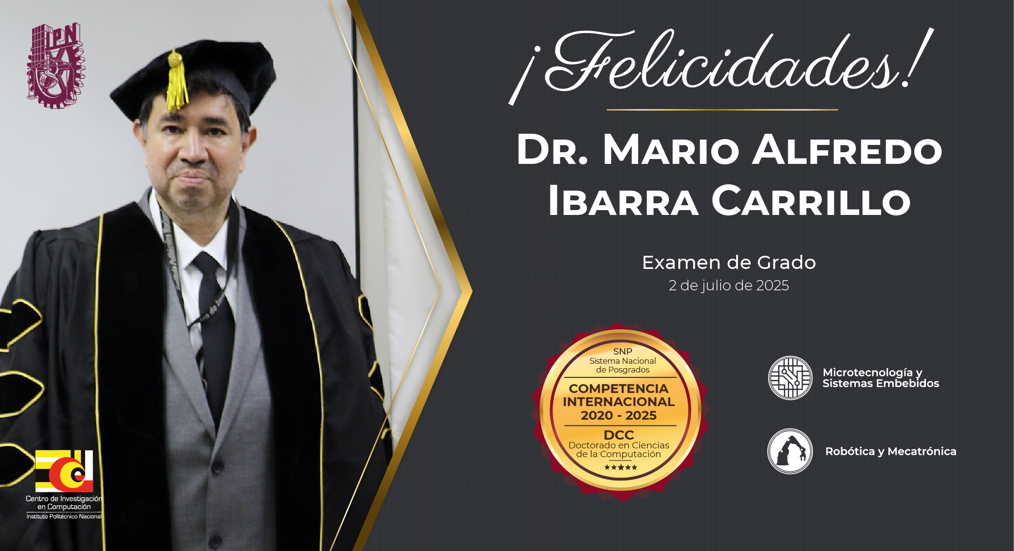 El Centro de Investigación en Computación felicita al Dr. Mario Alfredo Ibarra Carrillo egresado del Doctorado en Ciencias de la Computación del laboratorio de Robótica y Mecatrónica y laboratorio de Microtecnología y Sistemas Embebidos.