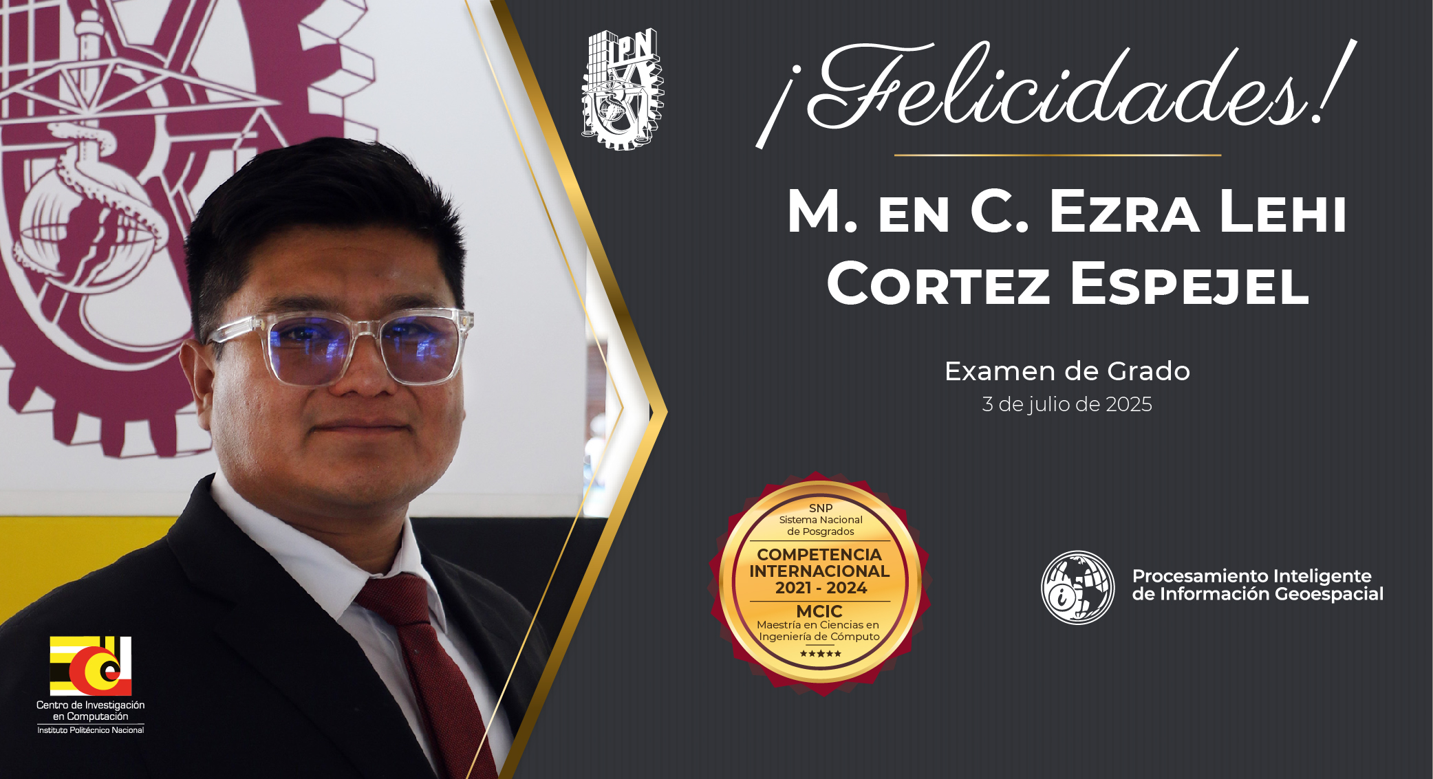 El Centro de Investigación en Computación felicita al M. en C. Ezra Lehi Cortez Espejel egresado de la Maestría en Ciencias en Ingeniería de Cómputo del laboratorio de Procesamiento Inteligente de Información Geoespacial.