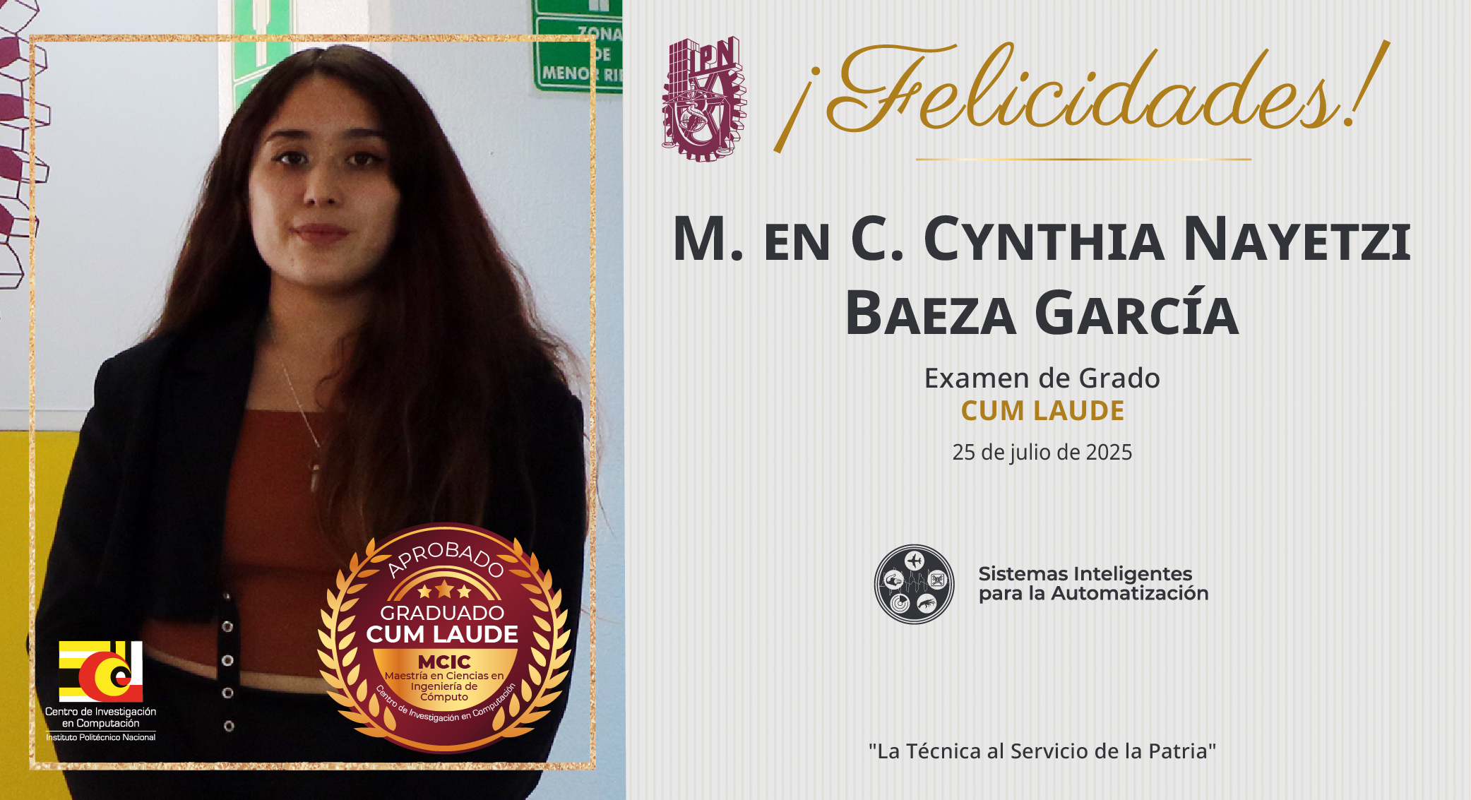El Centro de Investigación en Computación felicita a la M. en C. Cynthia Nayetzi Baeza García egresada CUM LAUDE de la Maestría en Ciencias en Ingeniería de Cómputo del laboratorio de Sistemas Inteligentes para la Automatización.