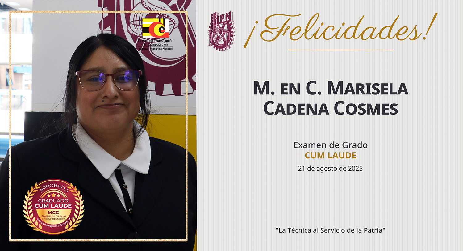 El Centro de Investigación en Computación felicita a la M. en C. Marisela Cadena Cosmes egresada CUM LAUDE de la Maestría en Ciencias en de la Computación del laboratorio de Procesamiento Inteligente de Información Geoespacial.