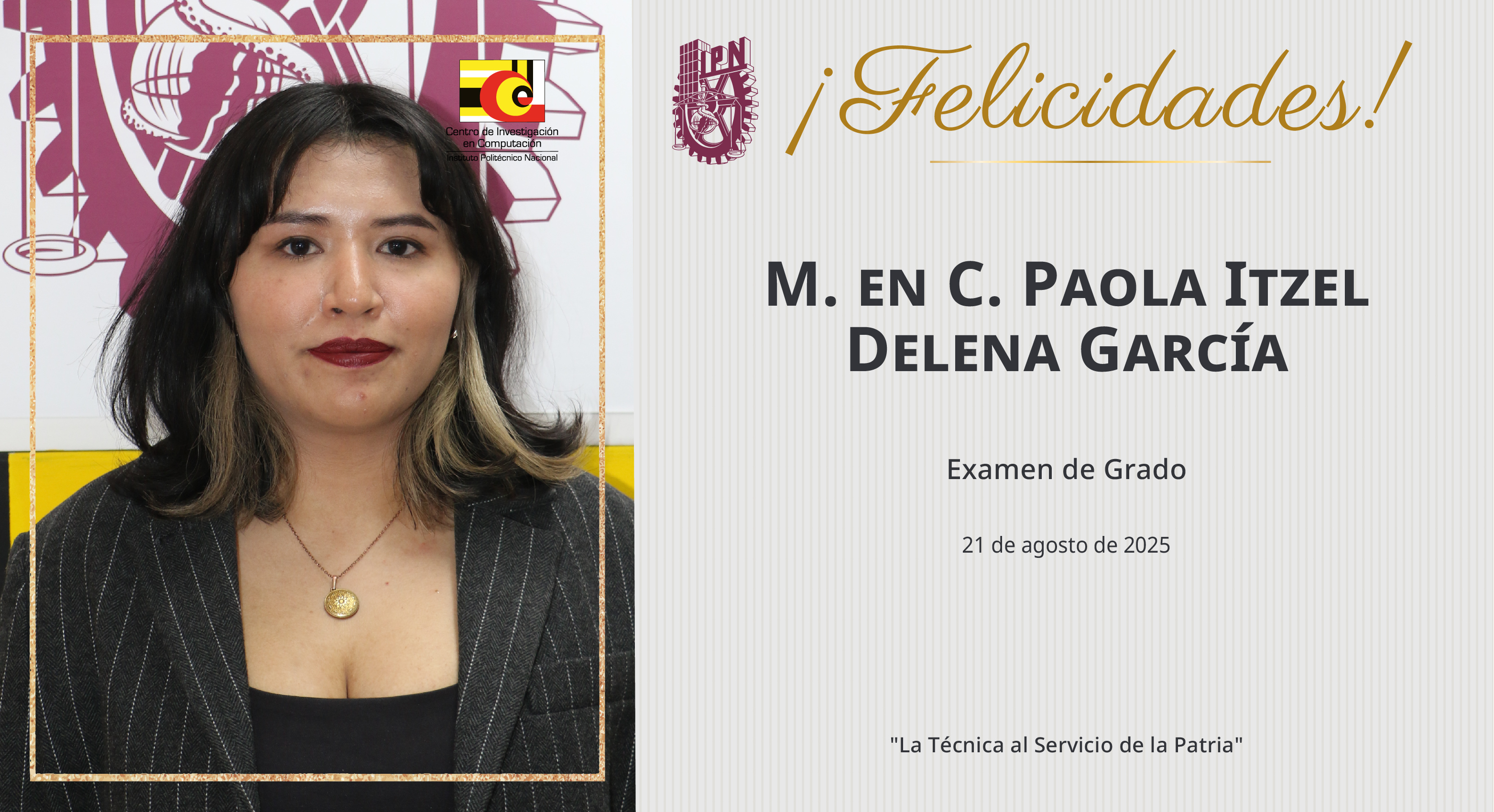 El Centro de Investigación en Computación felicita a la M. en C. Paola Itzel Delena García egresada de la Maestría en Ciencias en de la Computación del laboratorio de Cómputo Inteligentes.