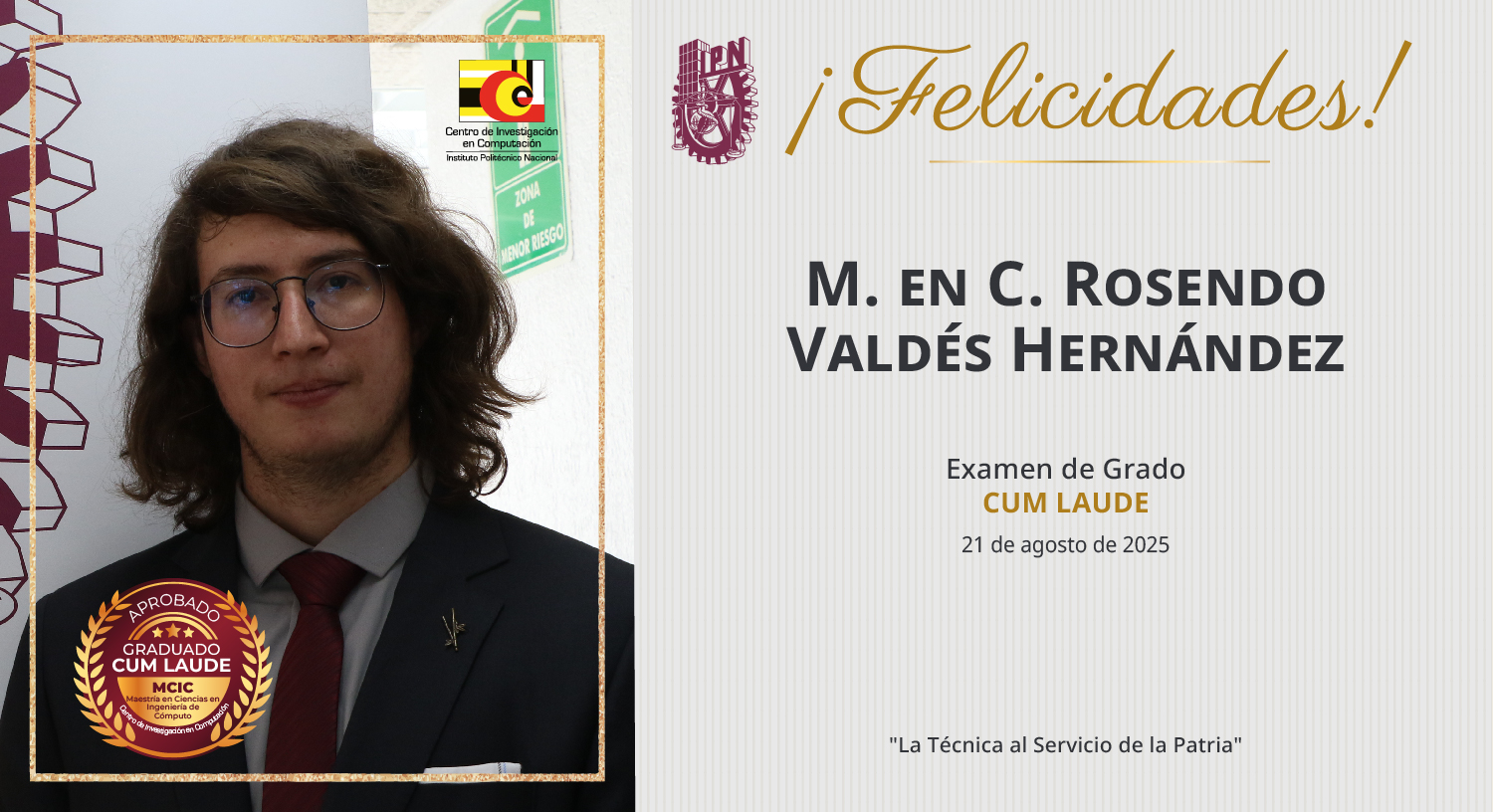 El Centro de Investigación en Computación felicita al M. en C. Rosendo Valdés Hernández egresado CUM LAUDE de la Maestría en Ciencias en Ingeniería de Cómputo del laboratorio de Microtecnología y Sistemas Embebidos.