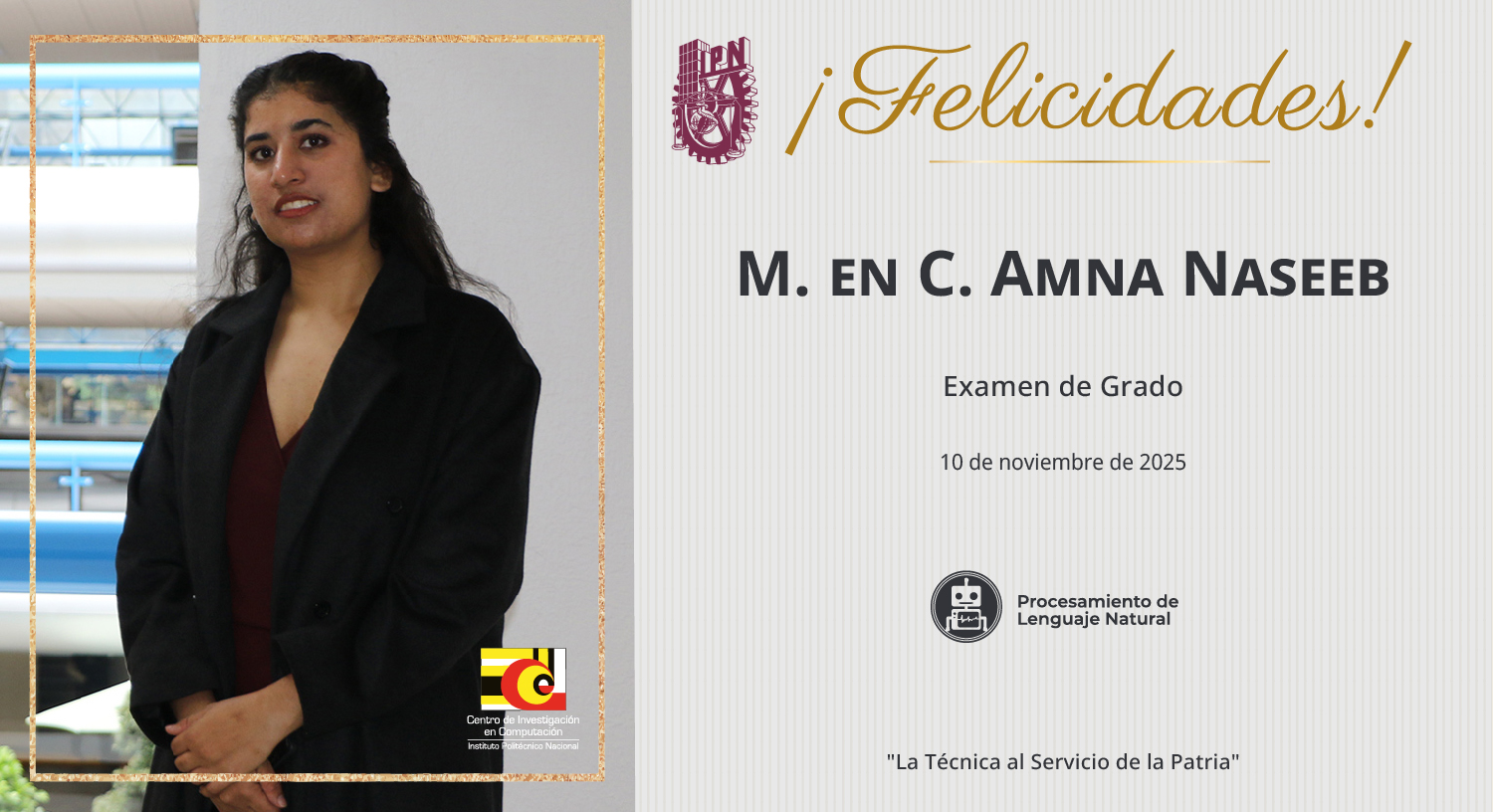 El Centro de Investigación en Computación felicita a la M. en C. Amna Naseeb egresada de la Maestría en Ciencias en Ingeniería de Cómputo del laboratorio de Procesamiento de Lenguaje Natural.