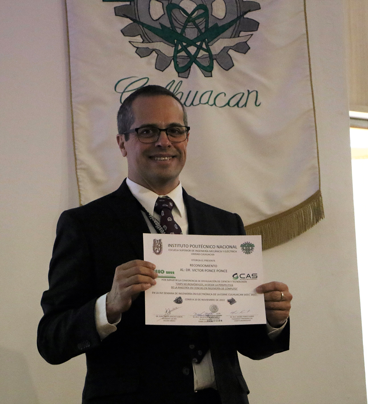“Chips neuromórficos, IA desde la perspectiva de la Maestría en Ciencias en Ingeniería de Cómputo” fue el nombre de la conferencia que impartió el Dr. Víctor Hugo Ponce Ponce, jefe del Laboratorio de Microtecnología y Sistemas Embebidos (MICROSE) y coordinador de la Maestría en Ciencias en Ingeniería de Cómputo (MCIC) del CIC IPN, dentro de las actividades de la “Semana de Ingeniería Electrónica” que se llevó a cabo en la Escuela Superior de Ingeniería Mecánica y Eléctrica (ESIME) Unidad Culhuacan.